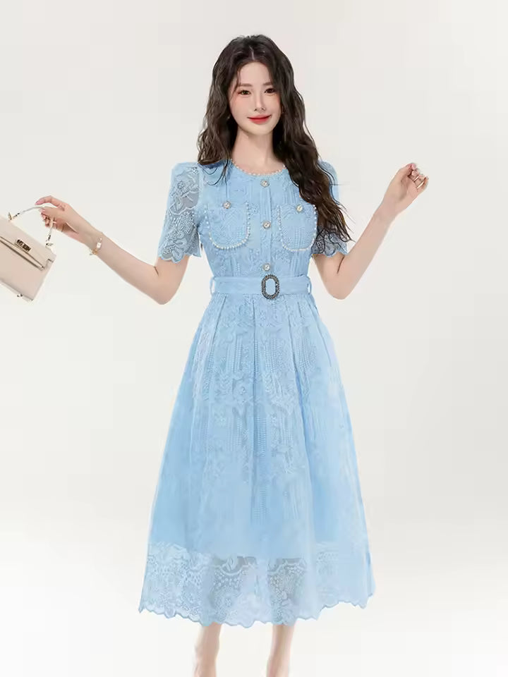 I dettagli in pizzo ricamato aggiungono un tocco romantico e sofisticato, rendendo l’abito adatto anche per feste e compleanni.